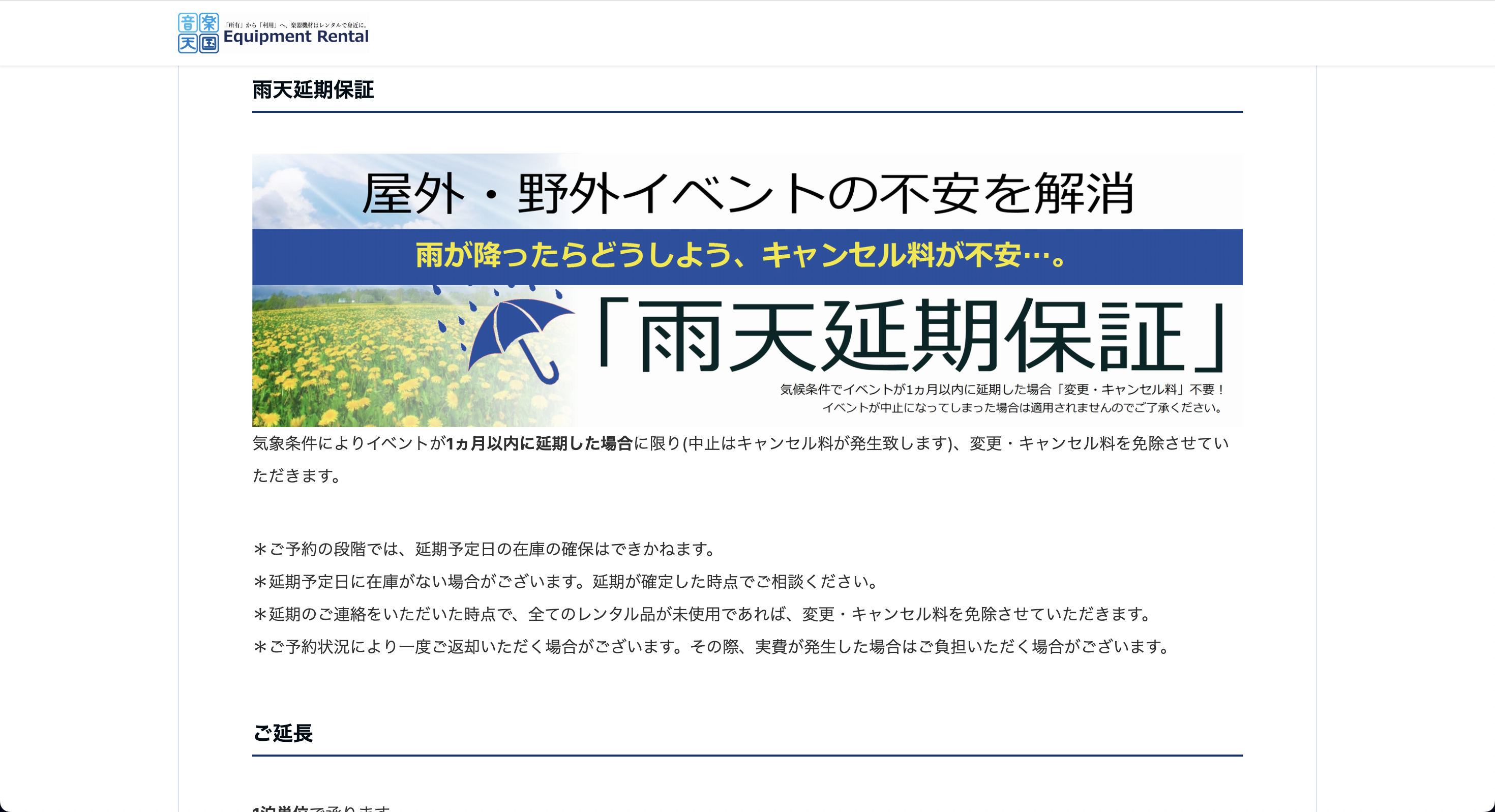 ※雨天延期保証に関しては、上の画像の通り「延期予定日の在庫の確保はできかねます。延期が確定した時点でご相談ください」といった規約になっています。