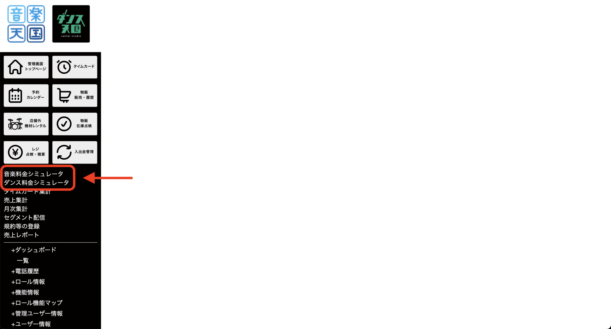 管理画面のメニューから、音楽・ダンスそれぞれの料金シミュレータを選択して料金確認が可能となりました。