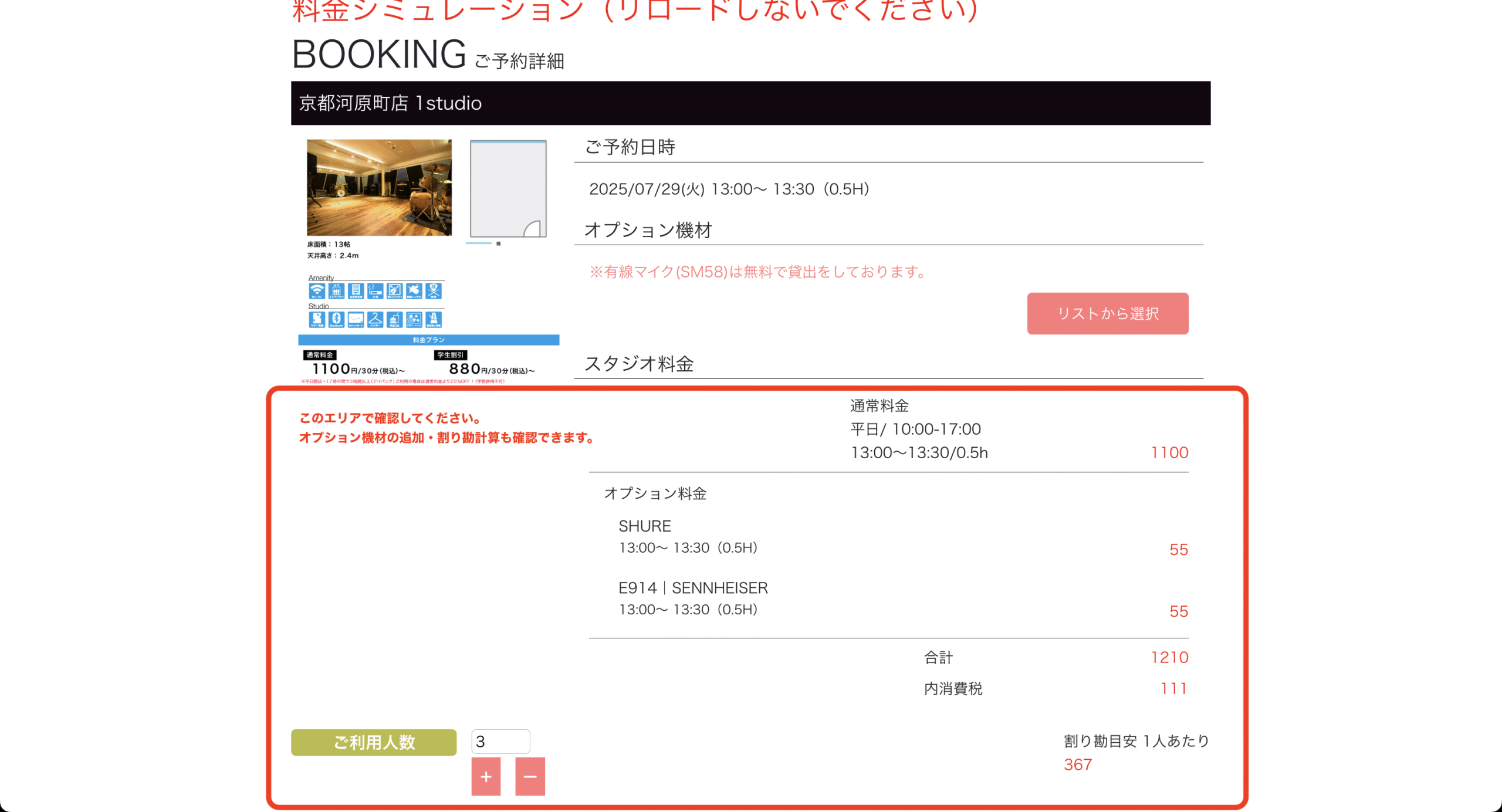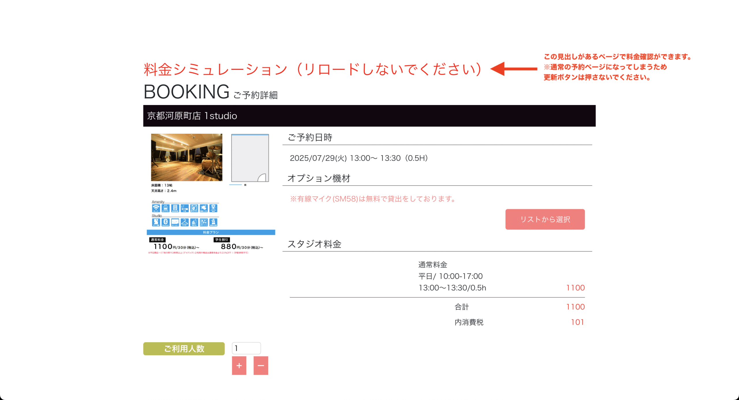 ※料金シミュレータの見出しが目印です。既存ページのレイアウトをそのまま使用しているため、誤った操作で予約を追加しないよう十分注意してください。